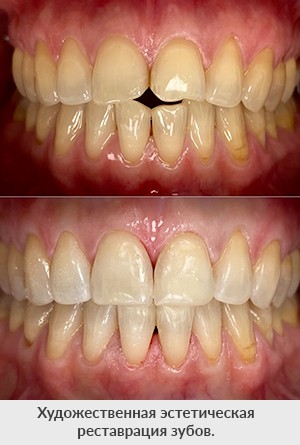 Художественная эстетическая реставрация зубов (прямая) или композитные виниры — это одноэтапный метод восстановления зубов, для которого используются композитные материалы. Терапевтическую художественную реставрацию проводят в течение нескольких часов, достаточно всего одного, двух визитов к врачу, при помощи композитных материалов. Их моделирование производит врач-стоматолог в полости рта.